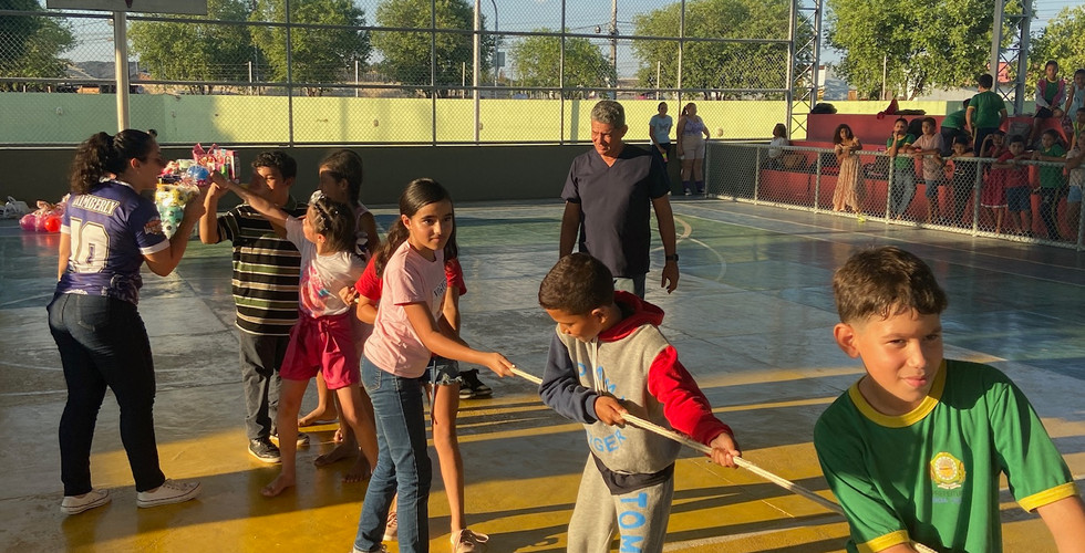 Gincana: dança das cadeiras, passagem de arco, passar bola, corrida de revezamento, cabo de guerra e 'batatinha frita, 123'.